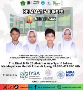 Alhamdulillah, kabar gembira datang dari panggung riset nasional! MAN 23 Al-Azhar Asy-Syarif kembali mengukir prestasi gemilang dengan meraih Medali Emas 🥇 dalam kompetisi NASPO–I2ASPO 6th (National and International Science Project Olympiad). Ajang bergengsi ini diselenggarakan oleh Indonesian Young Scientists Association (IYSA) bekerja sama dengan Fakultas MIPA Universitas Gadjah Mada (UGM) dan MIPA UGM.
